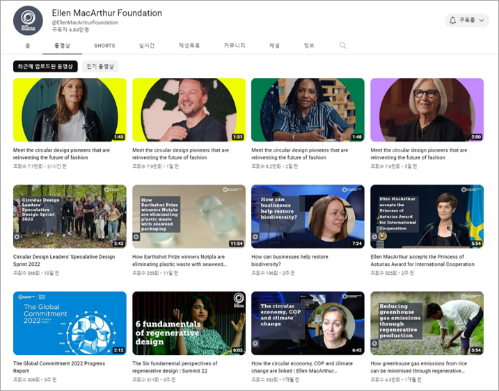 이 곳의 유튜브채널은 일반 영리기업을 비롯해 NGO, NPO, 정부기관, 연구소, 지역사회 등 다양한 주체들이 순환경제, 순환비즈니스를 어떻게 실험하고 실행하고 있는지에 대해 많은 사례들을 소개하고 있습니다.