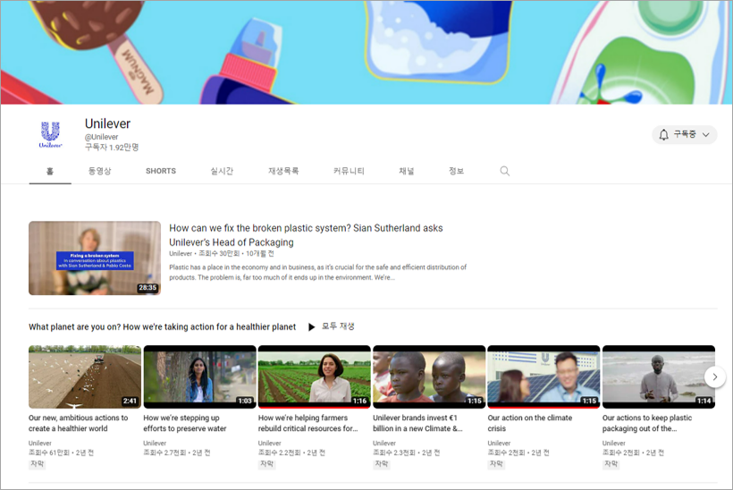 두 번째로 자주보는 유튜브 채널은 <유니레버>입니다. 전세계의 지속가능경영전문가들이 매년 지속가능경영을 잘하는 기업을 뽑는데요. 지난 10여년간 유니레버가 항상 최상위로 꼽히고 있습니다. 유니레버의 유튜브 채널을 가 보면 왜 그런지 짐작할 수 있습니다.