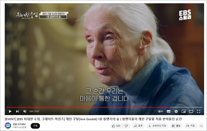 올해 공개된 영상 중에 제일 감명 깊었던 영상은 <제인 구달_나의 이야기>였습니다. 침팬지 연구가이자 환경운동가로 유명한 제인 구달 박사님이 자신의 이야기를 담담하게 풀어내시는 영상을 보며 '나도 저런 어른이 되었으면 참 좋겠다' 라는 아주 원대한(불가능한) 생각을 잠깐 하기도 했습니다.
