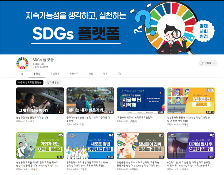 SDGs 플랫폼은 UN 지속가능발전목표와 청년을 주제로 다양한 이슈를 영상 콘텐츠로 만들어 제공하고 있는 유튜브채널입니다.