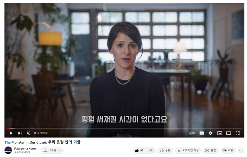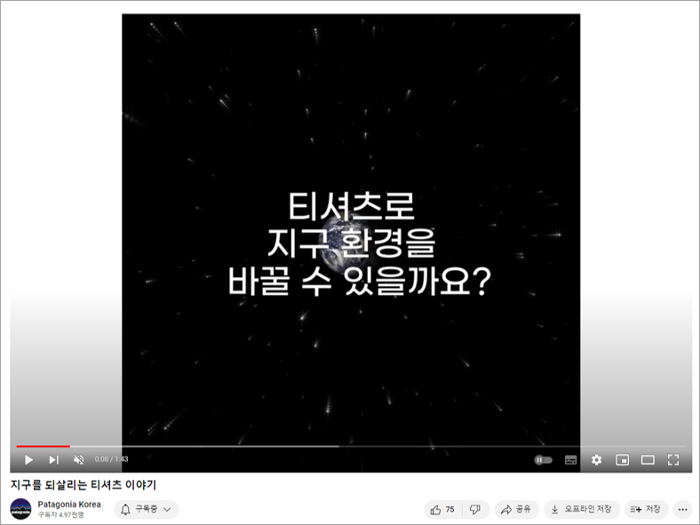 물론 파타고니아 유튜브 채널도 기업 PR 채널이기 때문에 제품 광고나 마케팅 콘텐츠가 많습니다. 그럼에도 불구하고 다른 회사 채널들과 비교할 때 지속가능경영에 관해 정말 좋은 자료들을 많이 제공하고 있습니다.